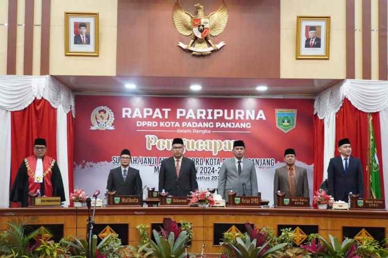 SUMATERAPOST.CO, PADANG PANJANG – Sebanyak 20 orang anggota Dewan Perwakilan Rakyat Daerah (DPRD) Kota Padang Panjang periode 2024-2029 resmi dilantik. Pengucapan sumpah janji dipandu Ketua Pengadilan Negeri, Agung Wicaksono, S.H, M.Kn di Ruang Sidang Gedung DPRD Kota padang Panjang, Selasa (13/8).