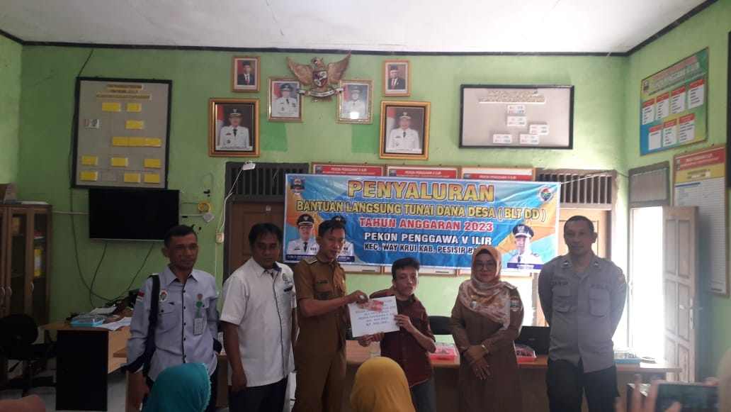 PESISIR BARAT – Pemerintahan Pekon Penghawa V Ilir, Kecamatan Way Krui membagikan Bantuan Langsung Tunai Dana Desa (BLT- DD) tahap kedua kepada 21 Keluarga Penerima Manfaat (KPM), Senin, (14/8/2023).