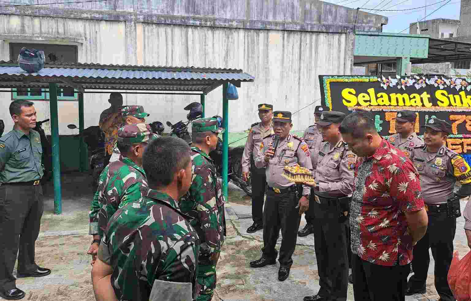 Sumaterapost.co – Sergai | Dalam rangka merayakan hari ulang tahun ke-78 TNI, Kapolsek Teluk Mengkudu, AKP J. Sagala bersama personel Polsek Teluk Mengkudu mengunjungi Danramil 09/TM.