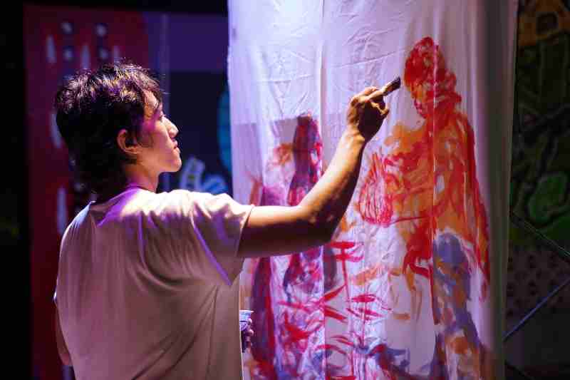Namun pengalaman sebelumnya membuatnya lebih siap. Anto pernah diajak oleh Mas Kartun melakukan live painting pada 2019, sebuah momen yang membiasakan dirinya bekerja di tengah suara bising dan suasana yang tak terduga. Karena itu, musik eksperimental SGRT tak mengganggu konsentrasinya sama sekali. Justru bagi Anto, bunyi-bunyi tak beraturan itu menjadi resonansi yang membantunya menangkap ritme suasana.