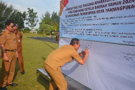 Sumaterapos.co | Tanjungpinang -Pemerintah Kota (Pemko) Tanjungpinang melaksanakan upacara dalam rangka penandatanganan pakta integritas netralitas ASN yang dipimpin langsung Penjabat (Pj.) Wali Kota Tanjungpinang, Andri Rizal, di halaman kantor Wali Kota, yang diikuti seluruh pegawai Pemko Tanjungpinang, Senin (4/11/2024).