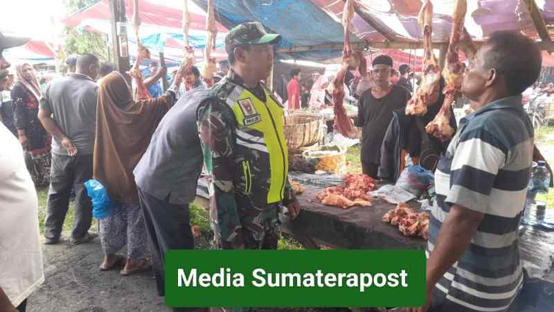 Babinsa secara langsung turun ke lapangan di pasar-pasar tradisional yang ada di wilayahnya untuk melakukan pemantauan harga sembako, dari hasil pantauan Babinsa di lapangan harga daging di pasar saat ini di bandrol yaitu” Daging Sapi Rp 140 Sampai 150 ribu Kg.