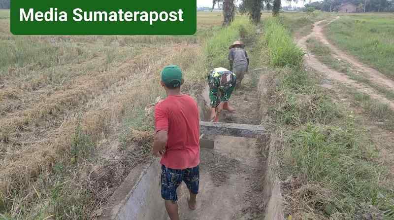 Bersama warga, Serda M Syahdan bekerja bakti membersihkan irigasi yang tersumbat tanah dan banyaknya rumput yang menyebabkan tersumbatnya aliran air pada areal persawahan milik warga Desa Sungai Kuruk Satu.