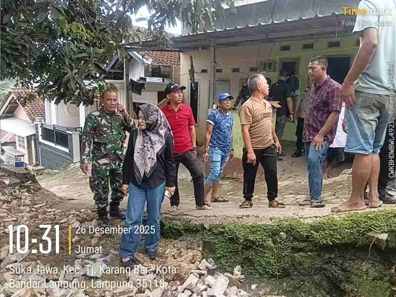 Bandar Lampung, 26 Desember 2025 – Solidaritas dan kecepatan tindakan menjadi kunci dalam penanganan darurat pasca-bencana tanah longsor yang melanda permukiman padat di Kota Bandar Lampung. Pagi ini, Jumat (26/12/2025), sekira pukul 08.30 WIB, hunian dua keluarga di Gang Marwan Atas, Kelurahan Suka Jawa, Kecamatan Tanjungkarang Barat (TKB), mengalami kerusakan parah akibat runtuhnya tembok pembatas rumah yang didahului hujan deras.