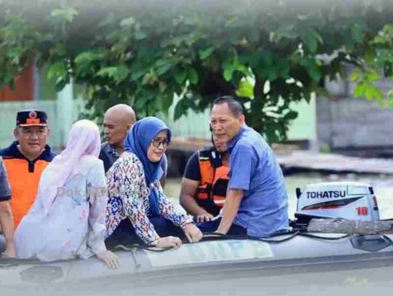 Sumaterapost co/Tulang Bawang – Bupati Tulang Bawang Drs.Qudrotul Ikhwan.,MM bersama Istri Ny.Herlinawati Qudrotul didampingi jajaran Forkopimda, meninjau lokasi banjir di Kampung Bugis, Kecamatan Menggala.