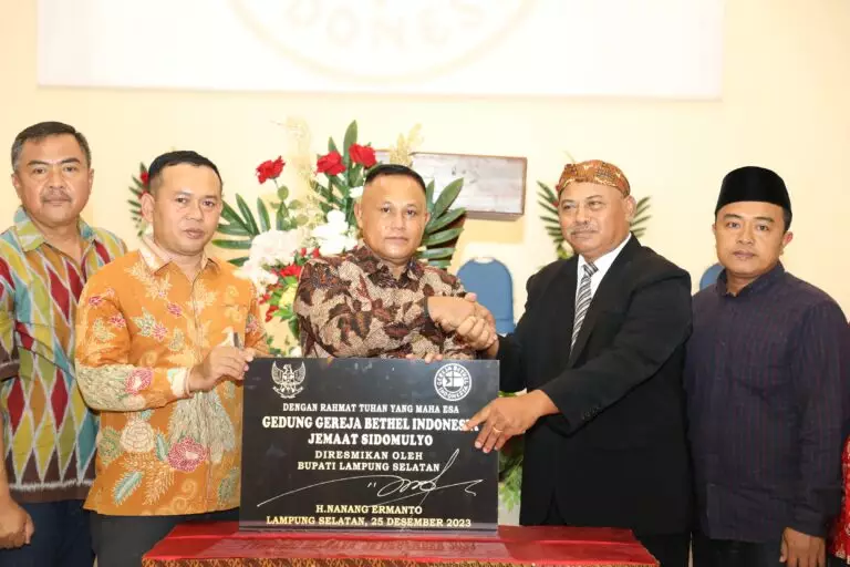 Sumaterapost.co – Bupati Lampung Selatan H. Nanang Ermanto meresmikan Gedung Gereja Bethel Indonesia (GBI) Jemaat Sidomulyo yang terletak di Dusun Damar Agung, Desa Sidomulyo, Senin, (25/12/2023).