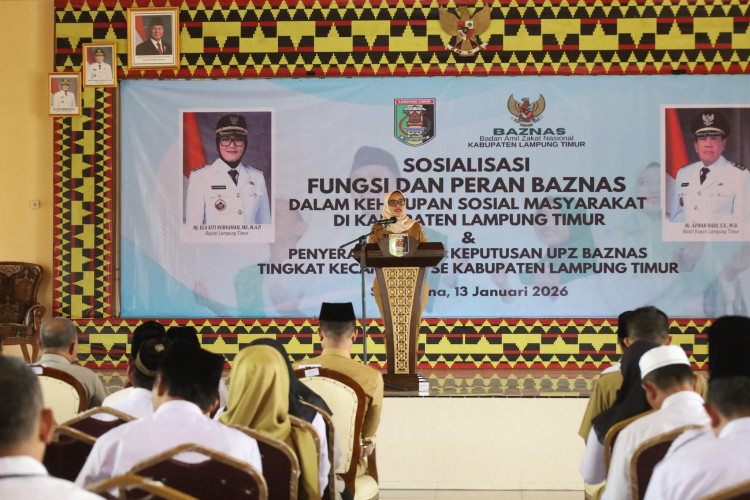 Lampung Timur – Bupati Lampung Timur, Ela Siti Nuryamah, menegaskan pentingnya peran Unit Pengumpul Zakat (UPZ) tingkat kecamatan sebagai ujung tombak pengelolaan zakat yang profesional, transparan, dan tepat sasaran. Hal tersebut disampaikannya saat memberikan sambutan dalam Penyerahan Surat Keputusan Badan Amil Zakat Nasional (BAZNAS) Kabupaten Lampung Timur tentang UPZ Tingkat Kecamatan se-Kabupaten Lampung Timur, yang berlangsung di Aula Rumah Dinas Bupati Lampung Timur, Selasa (13/01/2026).