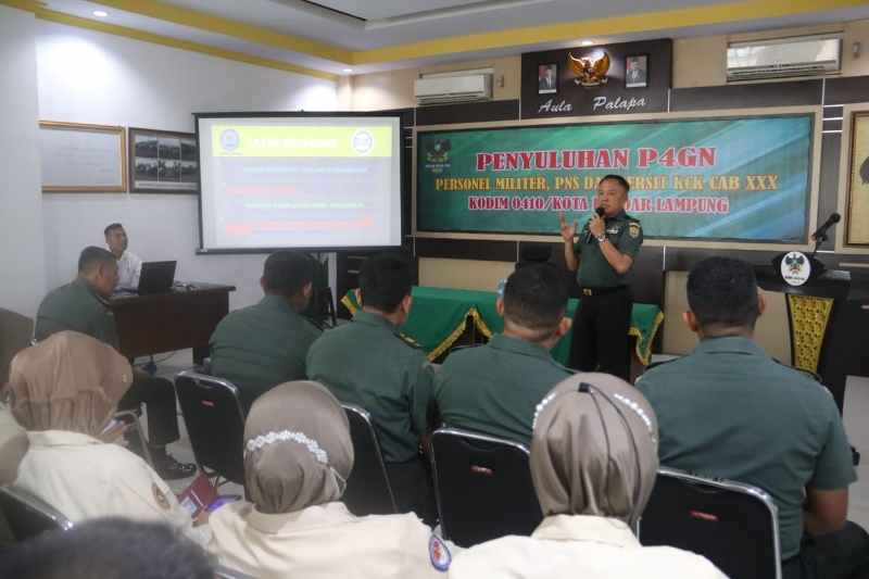 BANDAR LAMPUNG – Komando Distrik Militer (Kodim) 0410/Kota Bandar Lampung menggelar kegiatan Penyuluhan dan Sosialisasi Pencegahan Pemberantasan Penyalagunaan dan Peredaran Gelap Narkoba (P4GN) bagi Prajurit dan PNS Kodim 0410/Kota Bandar Lampung