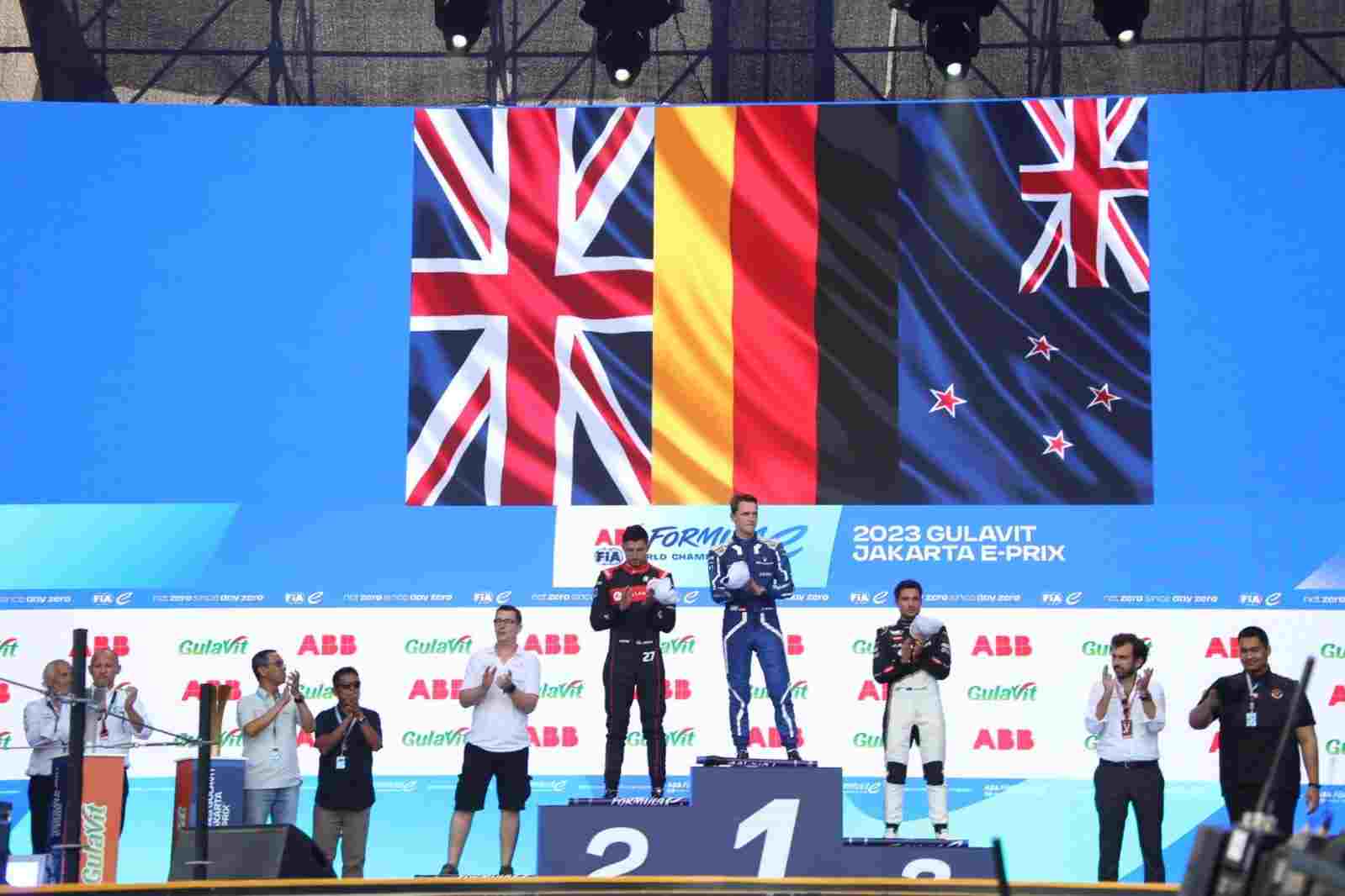 Juara kedua Jake Dennis (Inggris) dari tim Avalanche Andretti dan juara ketiga Mitch Evans (Australia) dari Jaguar TCS Racing.
