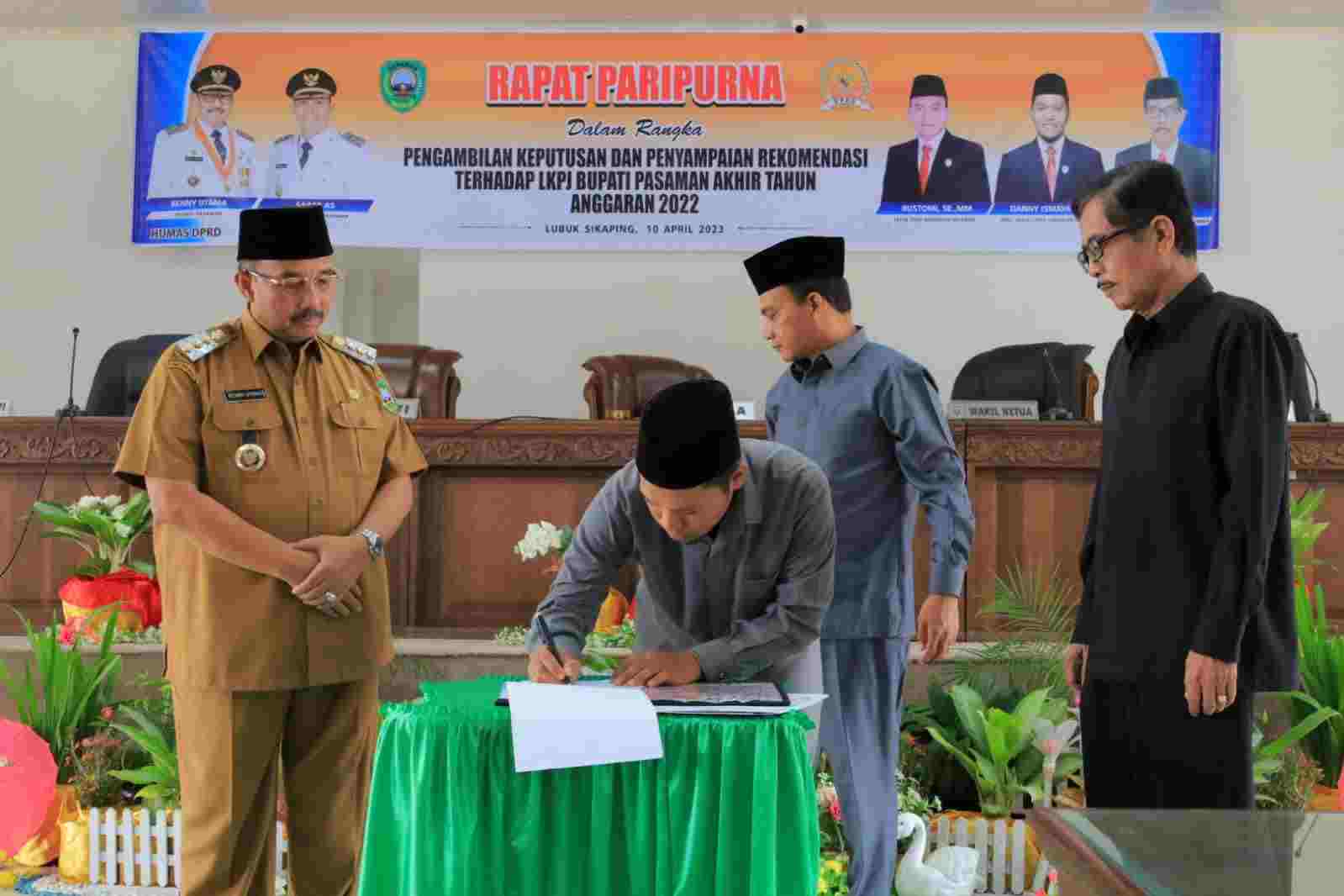 Setelah mendengarkan jawaban Bupati Pasaman atas pemandangan fraksi terhadap LKPJ akhir tahun 2022, seluruh fraksi – fraksi di DPRD Kabupaten Pasaman telah memahami dan menerima LKPJ Bupati Pasaman Akhir Tahun 2022. Sekaligus penyerahan dari bupati kepada ketua DPRD Pasaman Bustomi SE.