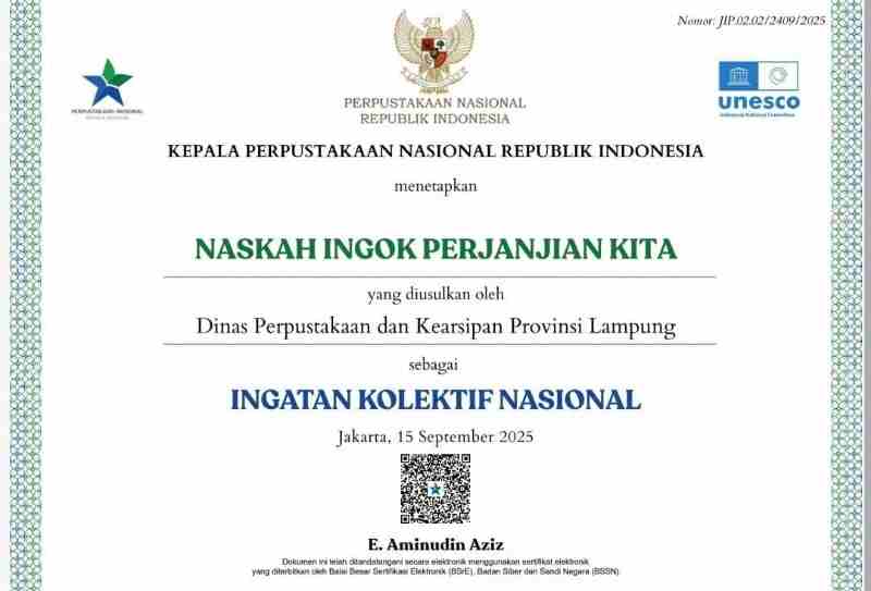 Bandar Lampung — Prestasi membanggakan kembali diraih oleh Provinsi Lampung di kancah nasional. Dua naskah kuno asal Provinsi Lampung berhasil meraih Sertifikat IKON (Ingatan Kolektif Nasional) Tahun 2025 dari Perpustakaan Nasional Republik Indonesia (Perpusnas RI).