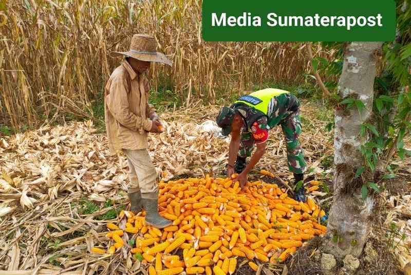 Aceh Tamiang | Sumaterapost – Babinsa Koramil 08/Rantau Serka Indra J Lubis melaksanakan pendampingan swasembada pangan membantu warga yang sedang panen jagung di Desa Rantau Pauh, Kecamatan Rantau, Kabupaten Aceh Tamiang. Minggu (28/04/2024)