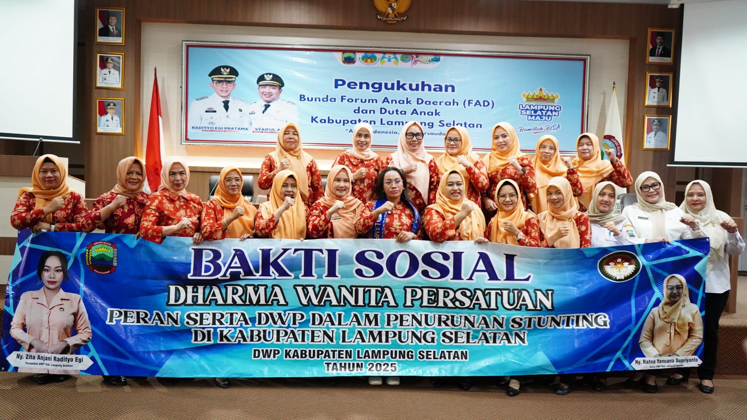 Sumaterapost.co — Dharma Wanita Persatuan (DWP) Kabupaten Lampung Selatan menggelar kegiatan Bakti Sosial kepada 26 anak stunting di Bumi Khagom Mufakat. Aksi sosial tersebut berlangsung bersamaan dengan pelantikan Zita Anjani sebagai Bunda Forum Anak Daerah (FAD) dan Duta Besar Anak Kabupaten Lampung Selatan.