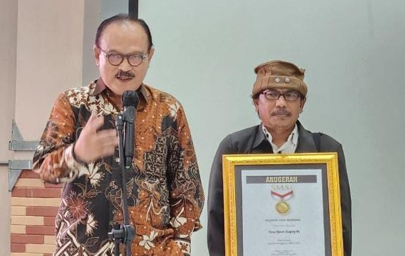Penyerahan anugerah SMSI didampingi oleh Wakil Ketua Umum SMSI Pusat Benz Jono Hartono Sastranegara kepada Eros Jarot.