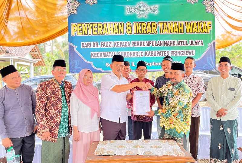 Sumaterapost.co | Pringsewu – Bakal Calon Bupati Pringsewu yang juga Wakil Bupati Pringsewu Periode 2017 – 2024 DR H. Fauzi, SE, M.Kom, A.Kt, C.A.MA mewakafkan sebidang tanah miliknya kepada perkumpulan Nahdlatul Ulama Kecamatan Sukoharjo.