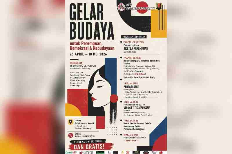 SEMARANG — Konsorsium Kerja Budaya (KKB) akan menggelar “Gelar Budaya untuk Perempuan, Demokrasi dan Kebudayaan” di Galeri Industri Kreatif pada 25 April hingga 10 Mei 2026. Kegiatan ini menghadirkan rangkaian pameran seni, diskusi, hingga pertunjukan lintas disiplin sebagai ruang refleksi atas posisi perempuan dalam lanskap demokrasi dan kebudayaan nasional.