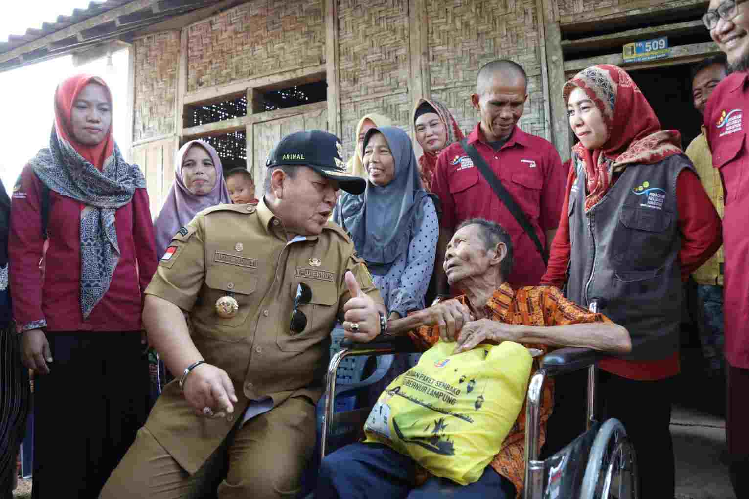 LAMPUNG TIMUR – Gubernur Lampung Arinal Djunaidi, didampingi Bupati Lampung Timur Dawam Rahardjo, memberikan bantuan dua unit kursi roda kepada warga lansia di Dusun 03, Desa Gedung Dalem, Kecamatan Batanghari Nuban, Lampung Timur, Selasa (22/8/2023).