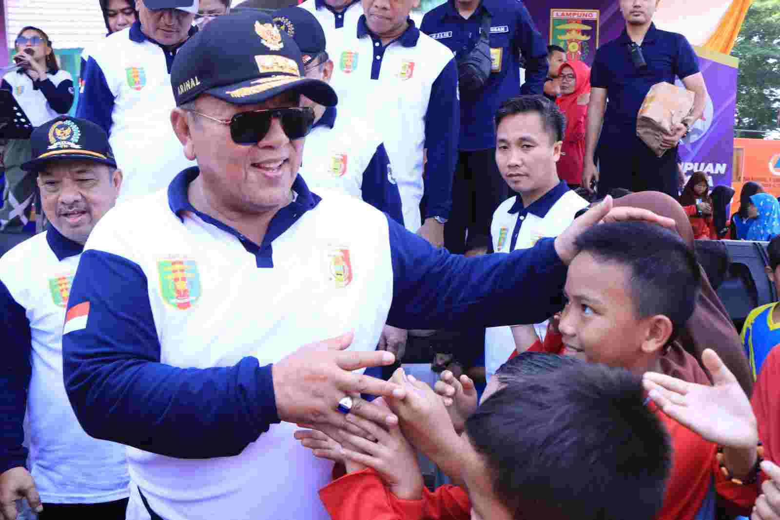 Sesaat setelah melepas peserta jalan sehat, Gubernur Arinal Djunaidi membaur bersama peserta untuk mengikuti jalan sehat dan menyelesaikan rute hingga garis finish.
