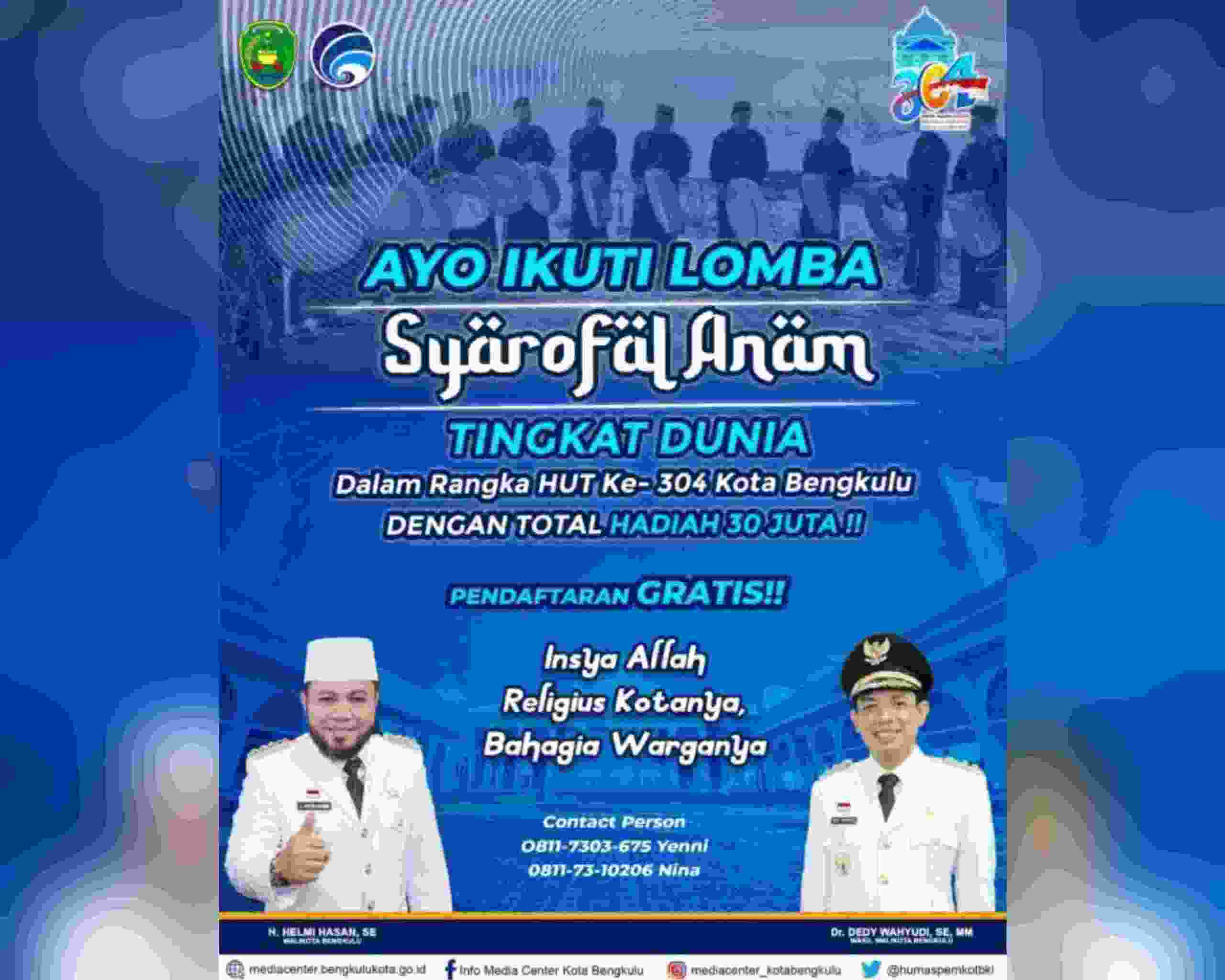 Bengkulu, Sumaterapost.co – Pemerintah Kota Bengkulu menggelar beragam lomba dan festival untuk memeriahkan Hari Jadi ke-304 Kota Bengkulu. Salah satunya lomba sarafal anam tingkat dunia dengan hadiah puluhan juta.