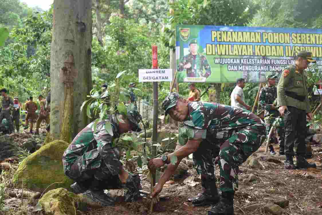 “ Hari ini, kami secara serentak bersama pemerintah daerah serta pihak terkait lainnya, melaksanakan penanaman pohon, yang dilaksanakan di seluruh wilayah Kodim-Kodim Jajaran Korem 043/Gatam dengan target penanaman 6300 batang pohon, diantaranya pohon durian, sengon, cemara, alpukat, pinang, jengkol, mangga, akasia, mahoni dan nangka, dengan tujuan mewujudkan kelestarian fungsi lingkungan hidup dan mengurangi dampak pencemaran. “ pungkasnya.