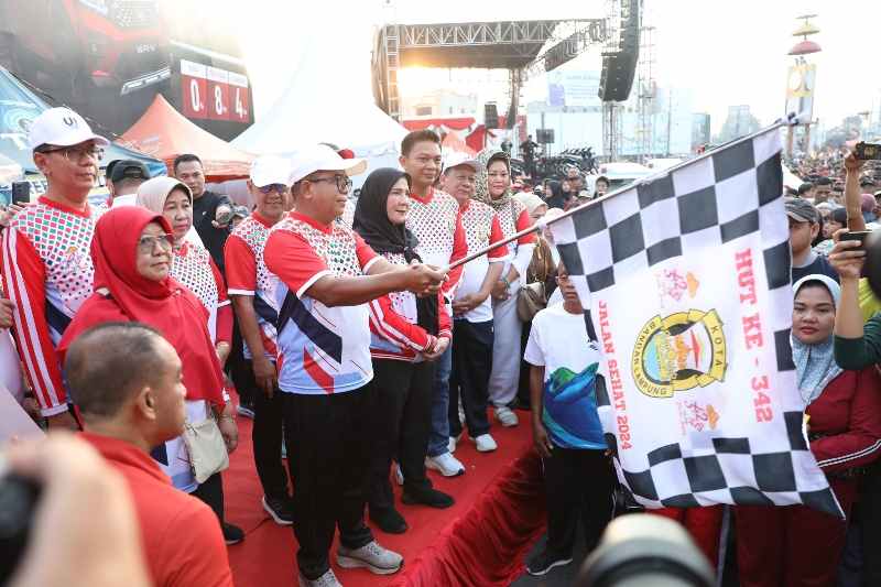 BANDARLAMPUNG – Pj. Gubernur Lampung Samsudin bersama Walikota Bandarlampung Eva Dwiana melepas peserta jalan sehat dalam rangka HUT Kota Bandarlampung ke- 342 di Tugu Adipura, Jalan Jendral Ahmad Yani, Bandarlampung, Minggu (23/6/2024).