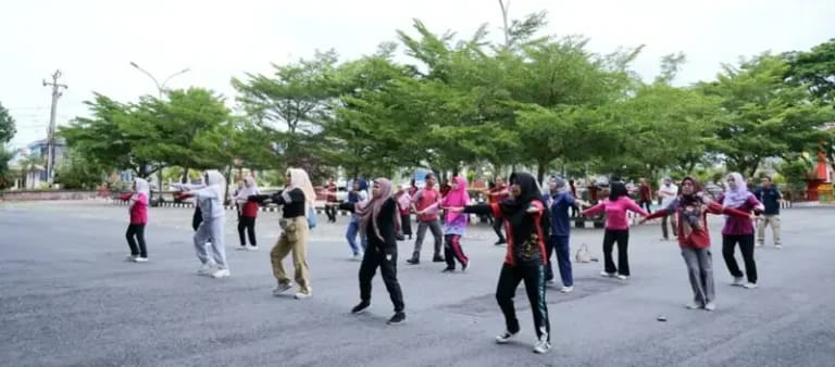 Kegiatan senam bersama yang dimulai pukul 07.30 WIB dipandu oleh instruktur profesional, dengan tujuan utama untuk menjaga kebugaran fisik.