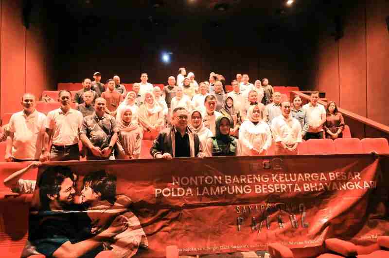 LAMPUNG – Kapolda Lampung Irjen Pol Helmy Santika bersama Wakapolda Brigjen Pol Ahmad Ramadhan dan para Pejabat Utama (PJU) Polda Lampung menghadiri acara nonton bersama film Sayap-Sayap Patah 2: Olivia di Studio XXI MBK Mall, Senin malam (12/5/2025).