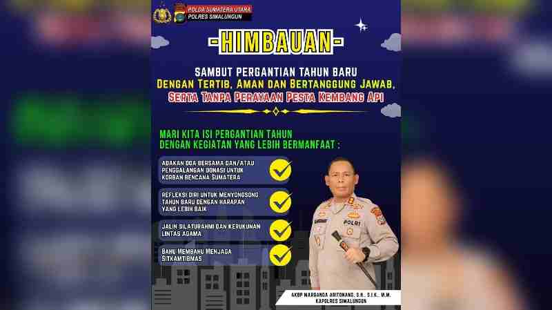 AKP Verry Purba mengungkap bahwa Kapolres Simalungun menghimbau seluruh masyarakat, khususnya warga Kabupaten Simalungun dan sekitarnya, agar menyambut pergantian Tahun Baru 2026 dengan penuh kesadaran dan tanggung jawab. “Kapolres menghimbau agar masyarakat menyambut Tahun Baru dengan tertib, aman, dan bertanggung jawab, serta tidak melakukan perayaan pesta kembang api,” ujar AKP Verry.