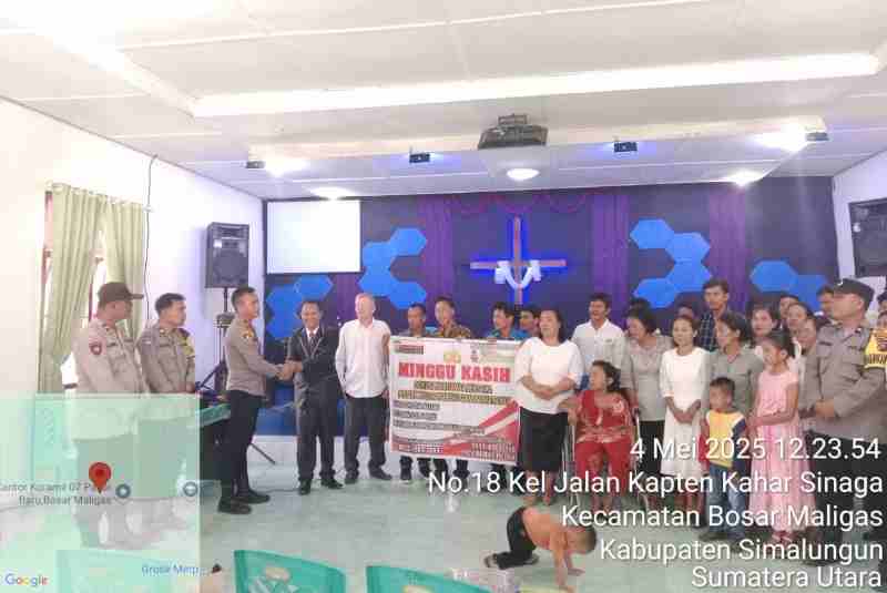Sumaterapost.co – Simalungun | Polsek Bosar Maligas kembali menunjukkan komitmennya dalam membangun hubungan harmonis dengan masyarakat melalui kegiatan “Minggu Kasih, Polri Untuk Masyarakat” yang digelar di Gereja GPdI Pasar Baru, Kelurahan Bosar Maligas, Kecamatan Bosar Maligas, Kabupaten Simalungun, Minggu (04/05/2025).