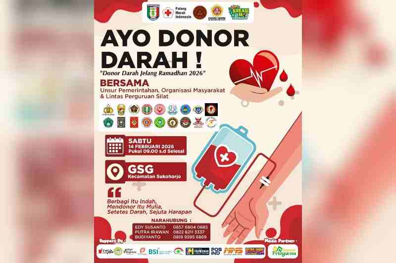 Donor Darah bertema ‘Berbagi itu indah, mendonor itu mulia, setetes darah, sejuta harapan’, itu dipusatkan di GSG Kecamatan Sukoharjo, pada Sabtu 14 Februari 2026, mulai pukul 09.00 Wib. Juga dalam rangkaian Hari Pers Nasional 2026 dan HUT PWI ke-80.