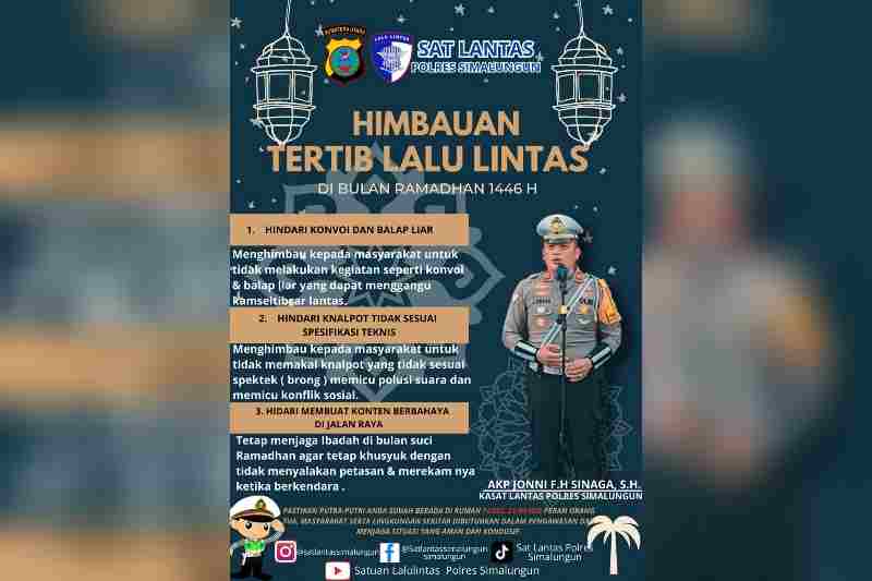 Sumaterapost.co – Simalungun | Menyambut bulan suci Ramadhan 1446 H/2025 M, Polres Simalungun mengeluarkan imbauan tertib lalu lintas untuk menjaga keamanan, keselamatan, ketertiban, dan kelancaran lalu lintas (Kamseltibcarlantas) di wilayah hukum Polres Simalungun. Himbauan tersebut disampaikan oleh Kasat Lantas Polres Simalungun AKP Jonni Fatiaro H Sinaga, SH, sebagai upaya profesional Polri dalam pengamanan kamtibmas.
