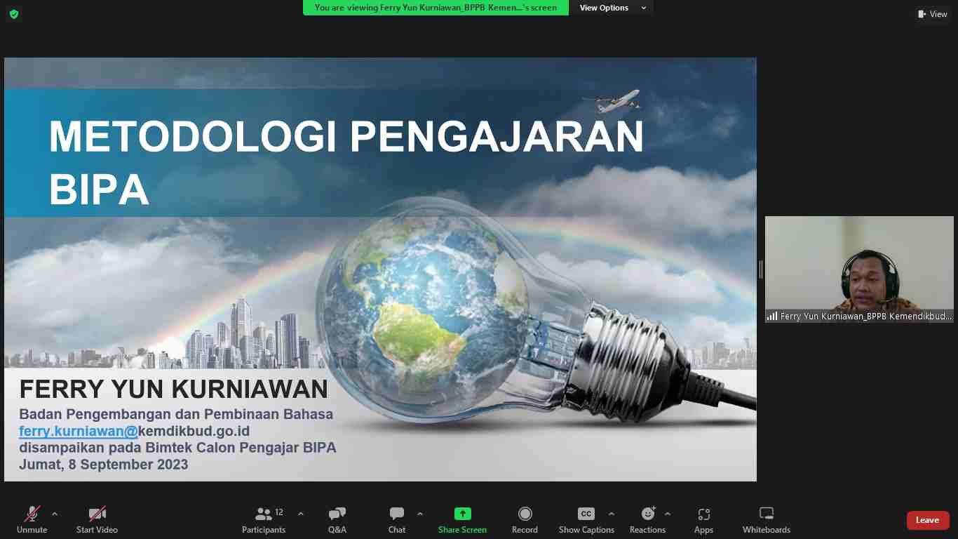 Dalam kesempatan itu, Ferry Yun Kurniawan menyampaikan Kemdikbud memiliki taget di tahun 2045 Bahasa Indonesia akan menjadi bahasa resmi yang diakui PBB. Terdapat beberapa materi yang terbagi dalam BIPA 1 hingga BIPA 6. ASN Badan Pengembangan dan Pembinaan Bahasa Kemdikbudristek RI ini juga membagikan metode pengajaran BIPA.