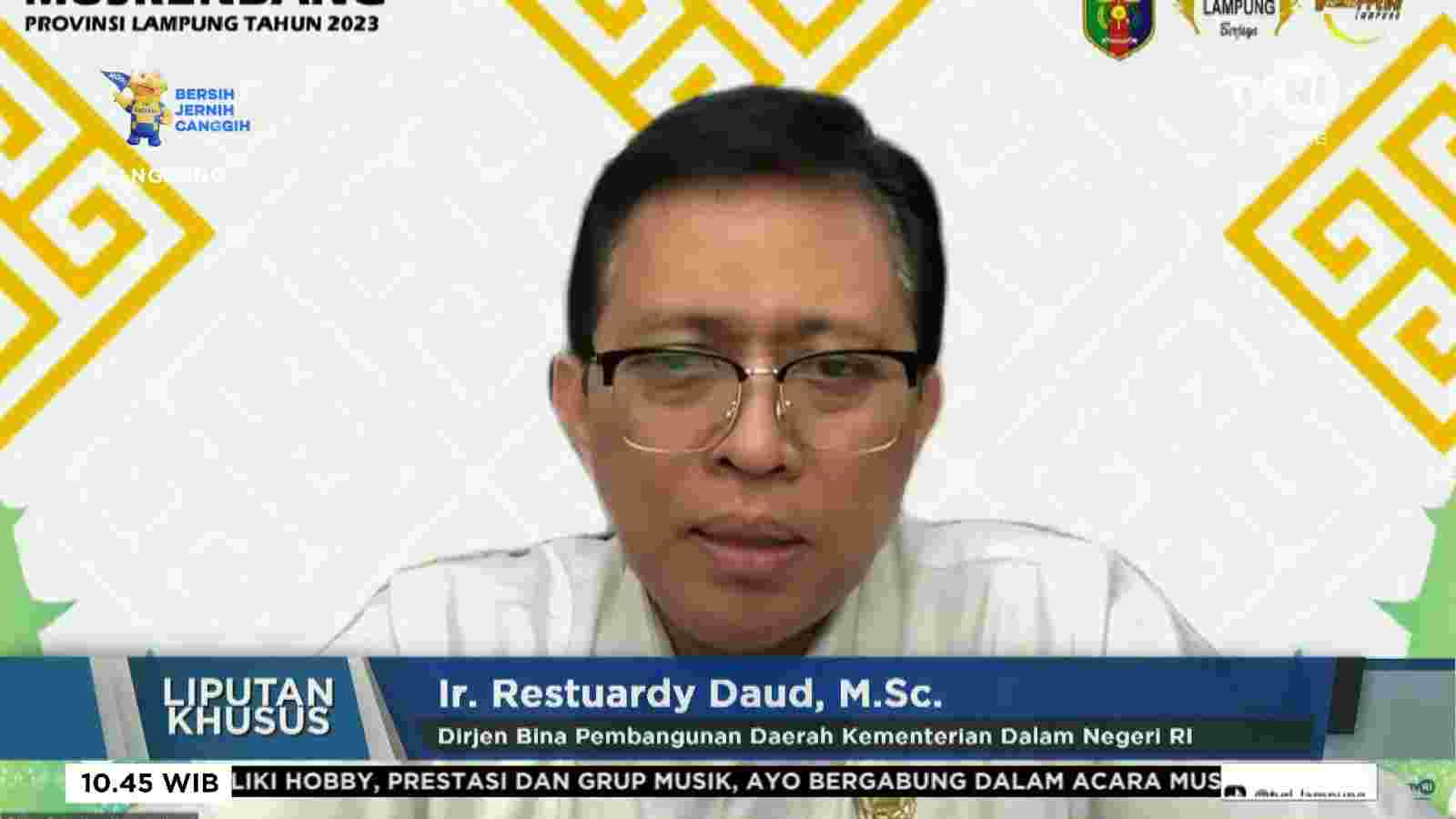 hal tersebut disampaikan Direktur Jendral Bina Pembangunan Daerah Ir. Restuardy Daud M.Sc, saat menghadiri Musrenbang Provinsi Lampung Tahun 2023 dalam rangka Penyusunan Rencana Kerja Pemerintah Daerah (RKPD) Provinsi Lampung Tahun 2024, di Ballroom Hotel Novotel, Rabu (29/03/2023).