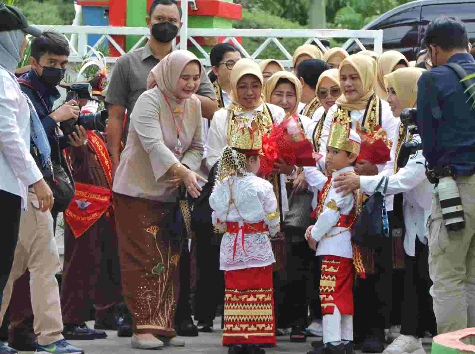 Bandar Lampung – Ketua TP. PKK Provinsi Lampung, Riana Sari Arinal mendampingi Ibu Negara, Iriana Joko Widodo bersama rombongan Organisasi Aksi Solidaritas Era Kabinet Indonesia Maju (OASE KIM) melakukan kunjungan di SDN 2 Rawa Laut Bandar Lampung, Rabu (8/3/2023).