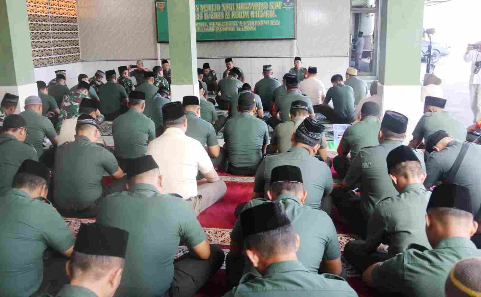 BANDAR LAMPUNG — Kodim 0410/Kota Bandar Lampung menggelar peringatan maulid Nabi Muhammad Shallallahu ‘Alaihi wa Sallam (SAW) 1445 H/2023 M, sejumlah Prajurit dan PNS mengikuti kegiatan dengan khidmat.