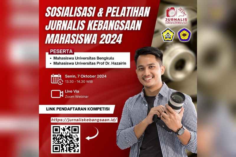 Kini tiba saatnya giliran Provinsi Bengkulu, dengan 2 perguruan tinggi kebanggaannya negeri dan swasta, sebagai representasi dari perguruan tinggi lainnya. Universitas Bengkulu (Unib) dan Universitas Hazairin (Unihaz), sebagai kampus negeri dan swasta, yang akan ikut meramaikan kompetisi Jurnalis Kebangsaan Mahasiswa BNPT tahun 2024 ini, yang akan dimulai hari Senin tanggal 7 Oktober yang akan datang.