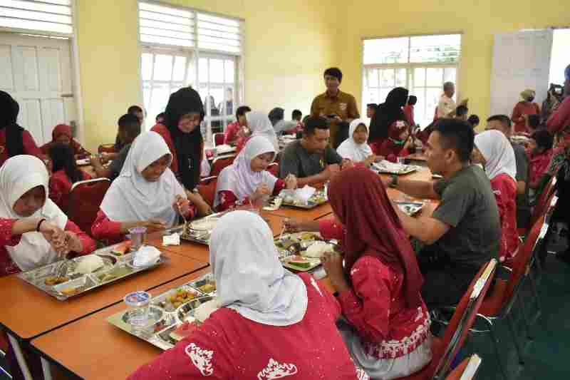 Kegiatan makan siang bergizi gratis bersama prajurit, guru dan siswa siswi SLB Dharma Bhakti Dharma Pertiwi Bandar Lampung di ikuti lebih kurang 400 orang ini merupakan kegiatan Korem 043/Gatam berserta Jajaran dalam rangka mendukung program pemerintah dalam hal ini makan siang bergizi.