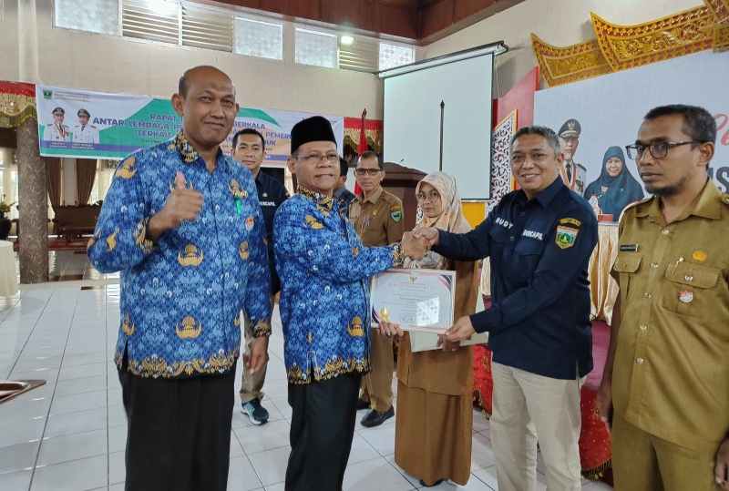 Penghargaan tersebut didapat melalui ajang penilaian yang digelar Disdukcapil Provinsi Sumatera Barat. Diterima Kepala Disdukcapil, Rudy Suarman, AP dari Kadis Dukcapil Sumbar, Drs. Besri Rahmad, MM di Balairung Istana Bung Hatta Kota Bukittinggi, Selasa (17/9). (H/Kim)