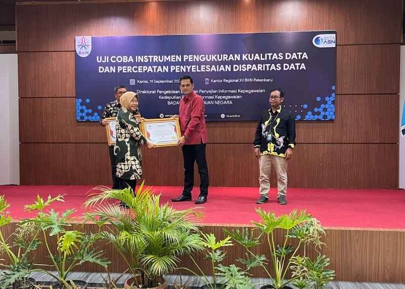 Penghargaan diserahkan Kepala Kanreg XII BKN, Anna Hasnah Hasaruddin, SE, MM yang diterima Sekretaris BKPSDM Padang Panjang Busmar Candra, S.Kom dalam kegiatan Uji Coba Instrumen Pengukuran Kualitas Data dan Percepatan Penyelesaian Disparitas Data, Kamis (19/9) di Kanreg XII BKN Pekanbaru.