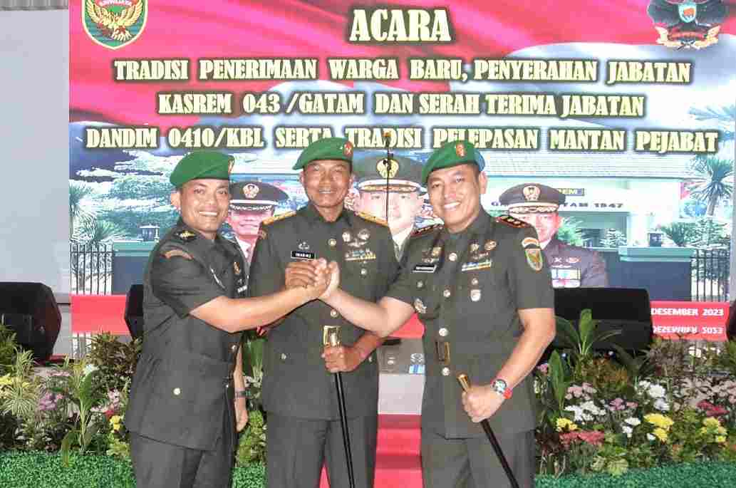 BANDAR LAMPUNG — Komandan Kodim 0410/KBL secara resmi dijabat oleh Letkol Arh Tan Kurniawan S.A.P.,M.I.Pol, menggantikan posisi pejabat Komandan Kodim yang lama Kolonel Arm Tri Arto Subagio M.Int.Rel.,MMDS. Serah terima jabatan dilakukan di Markas Korem 043 Garuda Hitam, Jln. Teuku Umar Bandar Lampung, pada Selasa (19/12/2023)