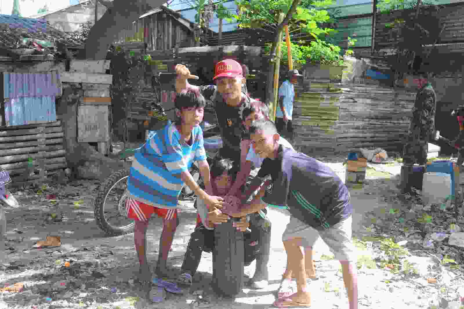 Jauh dari kata mewah, melainkan hanya dengan sebuah Ban bekas anggota TNI mampu menciptakan suasana gembira pada anak-anak di pesisir pantai tersebut.