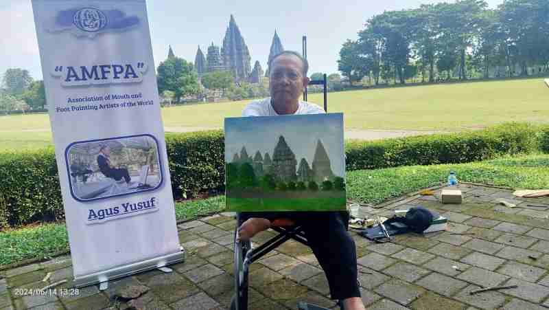 Agus Yusuf namanya. Dengan kaki sebagai perpanjangan rasa dan karsa, ia menggoreskan lanskap Prambanan ke atas kanvas, seolah menghidupkan kembali kejayaan masa silam melalui sentuhan paling tulus yang dimilikinya. Setiap gerakan bukan sekadar aksi teknis, tetapi bagian dari ritual sunyi yang penuh ketekunan. Di atas rerumputan hijau dan naungan sejarah, Agus tengah membangun jembatan antara keterbatasan dan kebebasan.