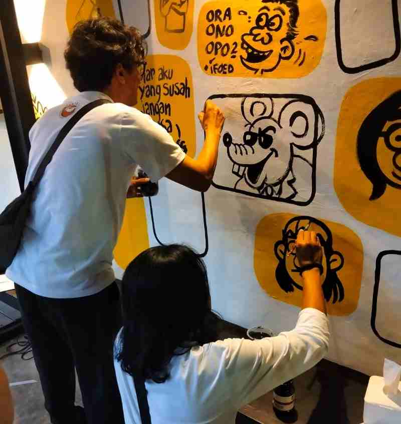 Selepas seremoni, panggung beralih ke “perform kartun”—para kartunis secara langsung melukis di tembok kosong. Garis-garis spontan menjelma wajah-wajah tokoh, simbol-simbol perlawanan, juga humor-humor nakal yang membuat penonton tak berhenti tertawa kecil.