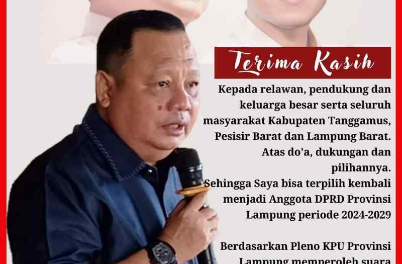 Anggota komisi IV DPRD provinsi lampung itu saat dikonfirmasi media pada sabtu (09/03/2024), mengaku bersyukur karena kembali terpilih sebagai anggota DPRD provinsi lampung dari dapil lampung IV.