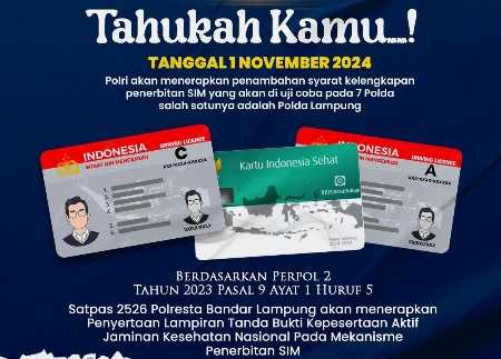 “Polri akan menerapkan penambahan syarat kelengkapan penerbitan SIM disertai melampirkan sebagai peserta BPJS Kesehatan pada semua kepolisian daerah, salah satunya adalah Polda Lampung,” ujarnya dikonfirmasi, Kamis (31/10/2024).