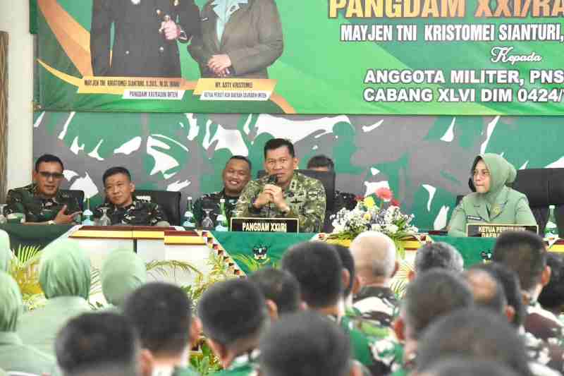 Usai kegiatan ramah tamah bersama Forkopimda Tanggamus dan Pringsewu, Pangdam XXI/Radin Inten didampingi Ketua Persit KCK Daerah XXI/Radin Inten memberikan pengarahan kepada seluruh prajurit dan anggota Persit Kodim 0424/Tanggamus.