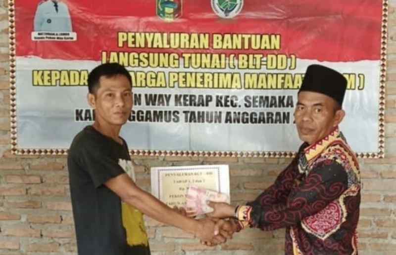 Sumaterapost.co | Tanggamus-Pemerintah Pekon Waykerap Kecamatan Semaka Kabupaten Tanggamus serahkan bantuan langsung tunai Dana Desa (BLT-DD) tahap pertama dihitung dari bulan Januari, Pebruari, Maret tahun 2024 kepada 30 keluarga penerima manfaat mendapatkan 300.000 perbulan masing-masing KPM mendapatkan 900.000 selama tiga bulan yang bertempat di balai Pekon Waykerap