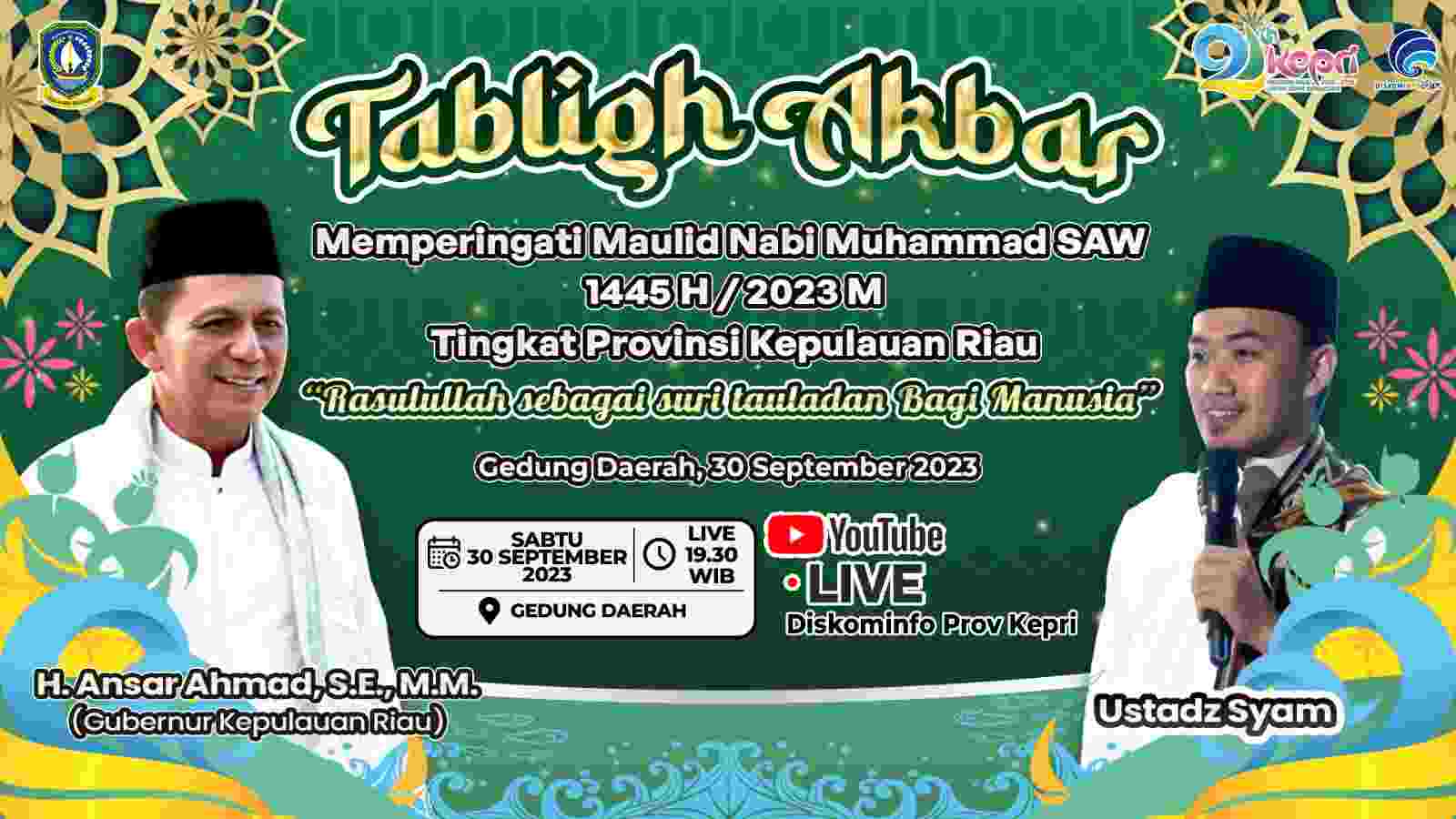 Sumaterapost.co | (Advetorial) – Pemerintah Provinsi Kepulauan Riau akan menggelar Tabligh Akbar dalam rangka memperingati Maulid Nabi Muhammad SAW dan sempena Hari Jadi ke-21 Provinsi Kepri. Acara ini akan diadakan pada Sabtu, 30 September 2023, di Gedung Daerah Tanjungpinang.