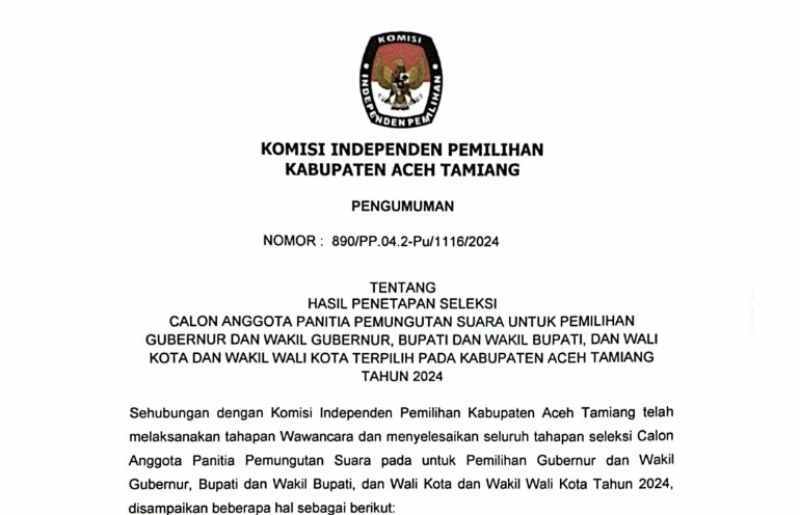 Pada 260001 Mei 2024 pengumuman hasil seleksi Panitia Pemungutan Suara (PPS) diumumkan melalui medsos, maupun website KIP Aceh Tamiang.