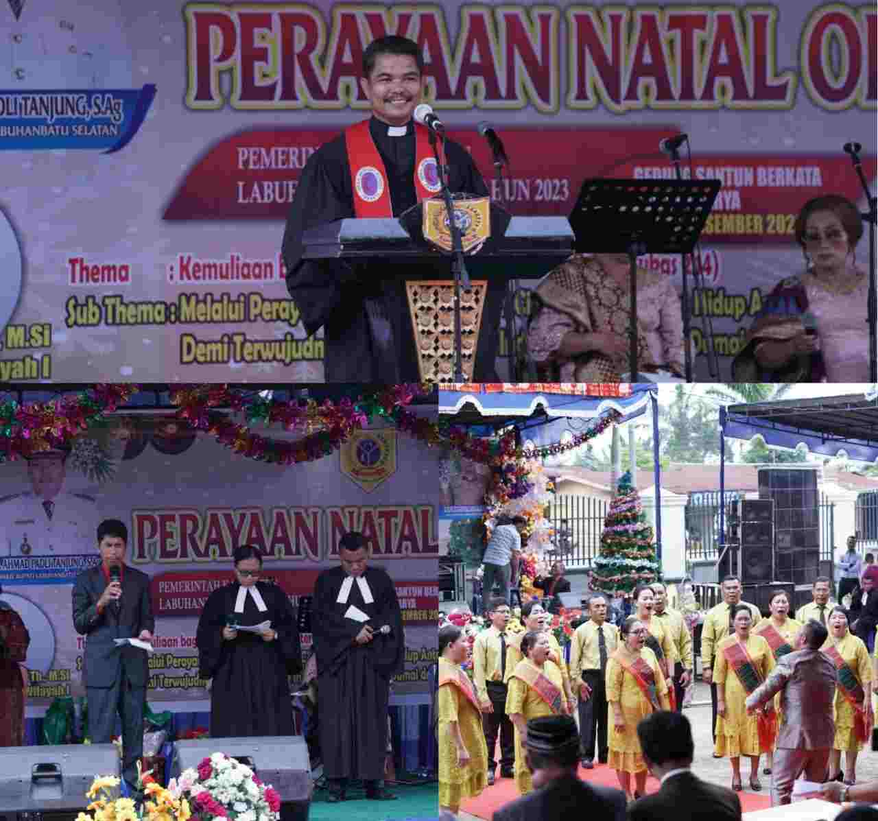 Labusel – Tema Natal Oikumene Pemerintahan Kabupaten Labuhanbatu Selatan tahun ini yaitu “Memuliakan bagi Allah dan Damai Sejahtera di Bumi”., yang di laksanakan di SBBK Kotapinang berjalan dengan penuh khidmad, Sabtu (16/12/2023).